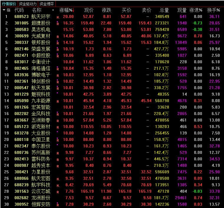 12月29日,商业航天板块内,航天环宇20cm涨停,超捷股份、昊志机电、光威复材、银邦股份涨超10%,荣盛发展、中超控股、中衡设计等10余股涨停,力星股份、航天宏图、航宇科技等多股跟涨。